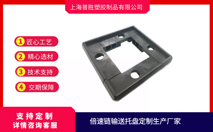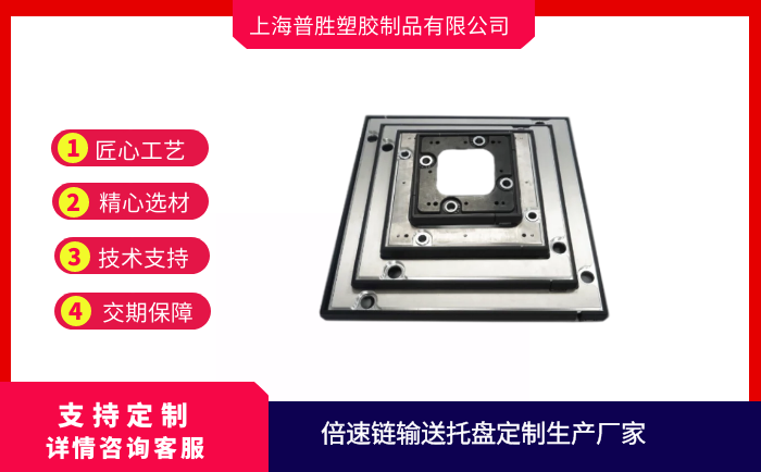 倍速鏈輸送托盤是自動化生產線必不可少的輸送工裝,它是直接放置在鏈條滾輪上方的承載物,被輸送的物料或工件直接放置在托盤上,因此工件托盤是根據被輸送工件的形狀和尺寸專門設計的,由于托盤是放置在倍速鏈鏈條上隨鏈條一起運動的,托盤有金屬材質及塑料材質,框架上有耐磨條。托盤輸送過程中會產生損傷,為了便于安裝,因此在托盤的4個角安裝滾輪,托盤的最外邊與線體內側預留10mm間隙,防止運行過程中與線體邊緣出現卡滯現象。
